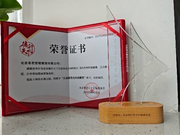 2025年9月19日,在北京德行天下公益基金会成立十周年之际,北京希若营销策划有限公司凭借在公益领域的持续投入与创新实践,被该基金会授予「公益慈善杰出贡献奖」。这份荣誉不仅是对希若公益行动的高度认可,更成为双方携手深耕教育公益的温暖注脚。